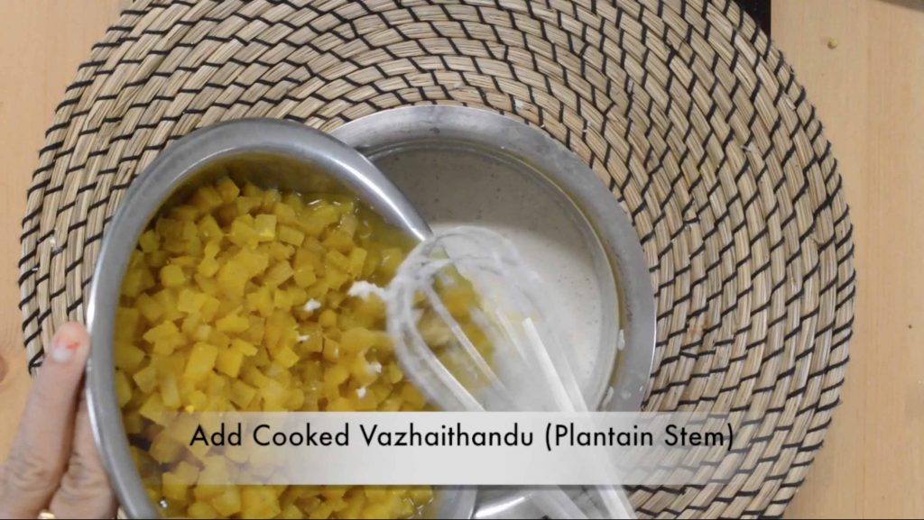 - In a vessel, add the curd and whisk well. If the curd is too thick, add little water and make it semi-thick. Add cooked vazhaithandu, coconut-spice paste and mix everything well