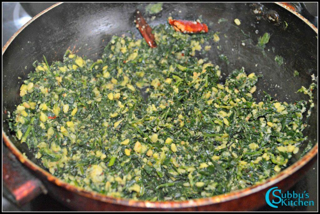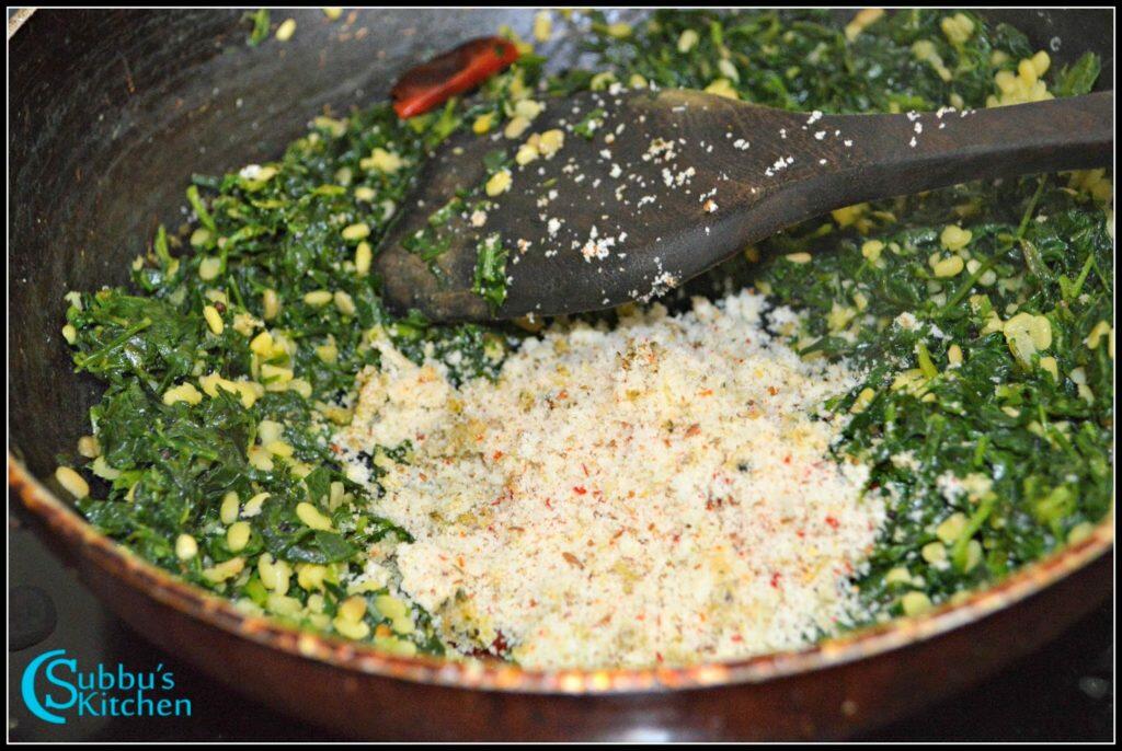- When the methi leaves are cooked, add the cooked dal and mix well. Finally add the ground powder and mix well and keep in flame for another minute and remove from flame