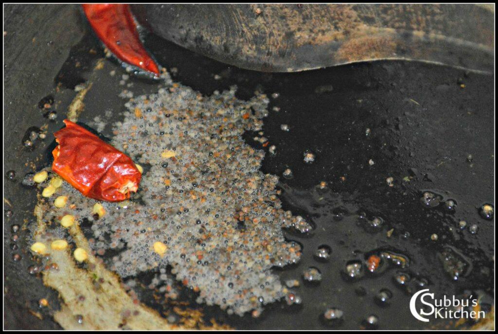 - Heat oil in a pan, add mustard seeds. When the mustard seeds starts to sputter, add urdhal and fry till it turns golden brown color and add broken red chillies and fry for a second.
