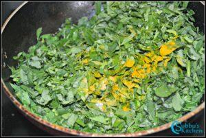 - To this add the cleaned keerai and allow the keerai to cook. Don’t add any water. The spinach will release its own water and that is enough to cook the leaves. It will take only 3-4 minutes to cook the methi leaves. Add salt and turmeric powder and allow the spinach to cook completely