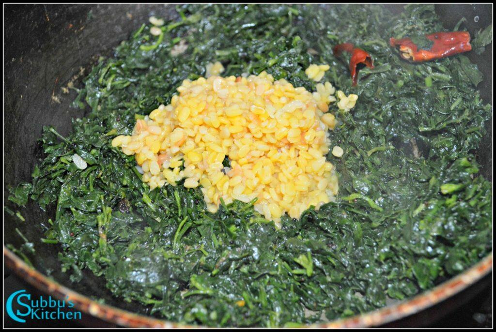 - When the methi leaves are cooked, add the cooked dal and mix well